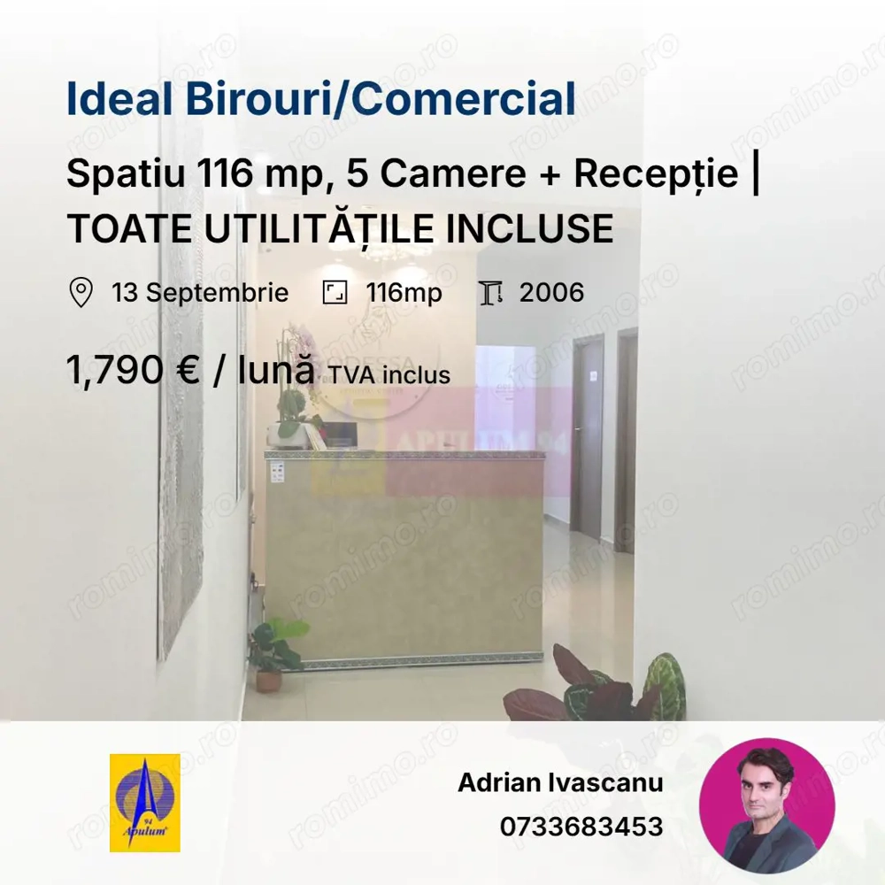 Spatiu 116 mp, 5 Camere + Recepție | TOATE UTILITĂȚILE INCLUSE