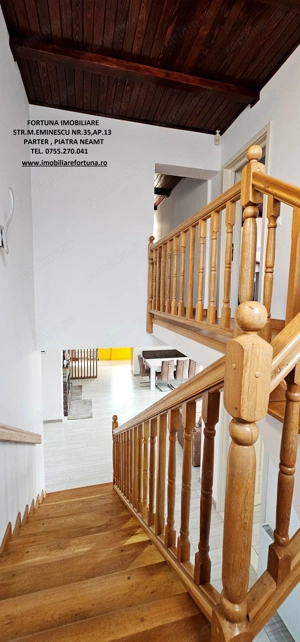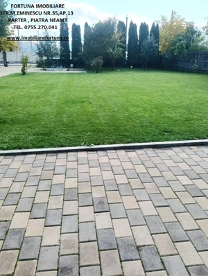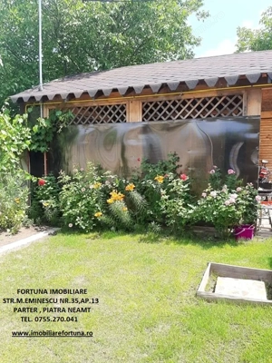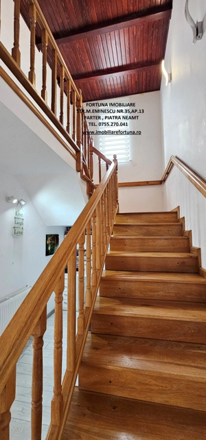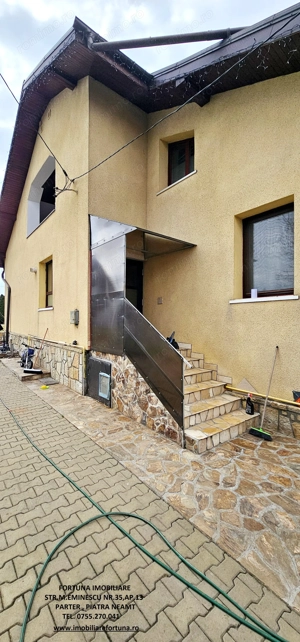 PROPRIETATE DE EXCEPȚIE, OAZĂ DE CONFORT ȘI VIBE DE ACASĂ VILĂ MOBILATĂ ȘI UTILATĂ, PLUS ANEXĂ ȘI TEREN, ÎN MUN. PIATRA NEAMȚ, 340.000 EURO Pentru cei care doresc să se bucure de facilitățile urbane, beneficiind totodată de liniște, verde și aer curat, FORTUNA IMOBILIARE propune spre achiziție această proprietate elegantă, îngrijită, primitoare, compusă din locuință, anexă și teren, situată într-o zonă liniștită, cu un view atractiv, din intravilanul Municipiului Piatra Neamț. Proprietatea este compusă din suprafața totală de 1.104 mp teren, pe care este edificată o casă cu regim de înălțime P+M, cu suprafața construită la sol de 171,18 mp, suprafața utilă desfășurată de 265,33 mp ( suprafața utilă + terasă + balcon = 306,04 mp ), pe fundații din beton armat, zidărie din cărămidă, acoperită cu tablă profilată tip Lindab, prevăzută cu termosistem dublu, ferestre de termopan, uși interioare din lemn masiv, parchet, gresie, faianță etc. Casa este compartimentată astfel: ***Parterul oferă o zonă de locuit deschisă și dinamică: terasă mare acoperită, hol, baie (cu aerisire naturală), bucătărie generoasă, două dormitoare, dressing amenajat cu rafturi pentru haine și un living ( cu un șemineu pe lemne prevăzut cu difuzoare de căldură ) ce oferă spațiu suficient și confortabil pentru primirea și petrecerea timpului liber alături de cei dragi. ***Mansarda este compusă din: hol, 3 dormitoare mari cu ferestre termopan vitrate mari, completate cu ferestre tip Velux, ce adaugă un plus de lumină naturală, confort termic și vizual, un balcon mare tip terasă (cu ieșire dintr-un dormitor și din hol) de unde puteți contempla priveliștea, dressing și o baie foarte generoasă. ***Podul casei este izolat cu spumă și vată bazaltică, putând fi amenajat, dacă se dorește, după gusturi și nevoi. ***Planșeul dintre parter, mansardă și scara interioară sunt construite din beton armat, ceea ce asigură casei o rezistență crescută și siguranță în exploatare. Scara interioara este placată cu lemn masiv de stejar. Casa oferă un mod de viață relaxant si sănătos, fiind mobilată și decorată cu gust și suflet, fiind ideală pentru o familie cu mai mulți copii. Se remarcă printr-o configurație și o compartimentare inteligentă, ce îmbină stilul modernist cu confortul vremurilor contemporane. Proprietatea deține o anexă gospodărească - un foișor închis echipat complet - o zona de barbeque și minibar, pentru petrecerea timpului liber cu cei dragi, precum și o curte generoasă și minuțios amenajată, organizată cu alei cu pavele, 2 locuri de parcare, gazon, arbuști, plante ornamentale, tuia, o multitudine de flori, loc de joacă pentru copii, oferind suficient spațiu pentru a crea o atmosferă de relaxare în aer liber. Aceasta este împrejmuită cu gard solid cu temelie și elevație din beton armat. Ansamblul rezidențial beneficiază de sistem de supraveghere video, sistem de alarmare, închidere centralizată a porților, rețelistică internet tv telefonie și este conectat la toate utilitățile ( apă, curent, gaz metan ). Locuința se vinde complet mobilată și utilată, așa cum este prezentată în fotografii, facilitând o mutare imediată. Preț 340.000 euro . Pentru o prezentare detaliată a acestei oferte, furnizarea unor informații suplimentare referitoare la situația juridică identificarea imobilului și programarea unei vizionări, vă invităm la sediul nostru, Fortuna Imobiliare, situat pe str. M. Eminescu, nr. 35, ap. 13, parter, lângă fostul Tribunal, tel. contact 0755.270.041. Your comfort is our priority ! Oferta noastră completă o găsiți aici: